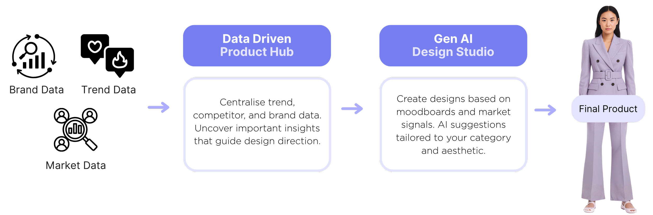 At the heart of Yoona.ai is a proprietary agentic model that combines Generative AI with a data intelligence hub. By analyzing market trends, competitor activity, and consumer behavior, Yoona translates complex data pipelines into actionable design proposals — from products and colors to artwork and beyond.